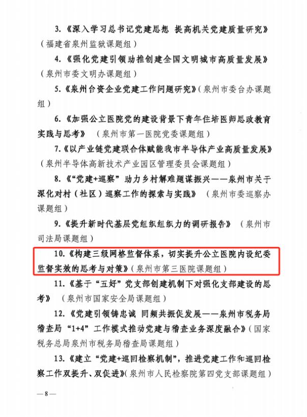 近日,福建省机关党建研究会泉州市分会公布了2024年度全市机关党建课题调研论文评选结果,性爱短视频 课题组报送的党建调研报告《构建三级网格监督体系,切实提升公立医院内设纪委监督实效的思考与对策》从200篇调研论文中脱颖而出,荣获2024年度全市机关党建调研课题调研论文三等奖。