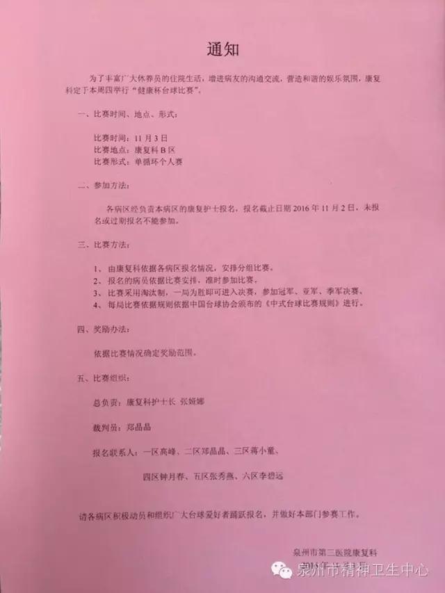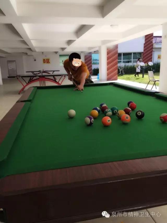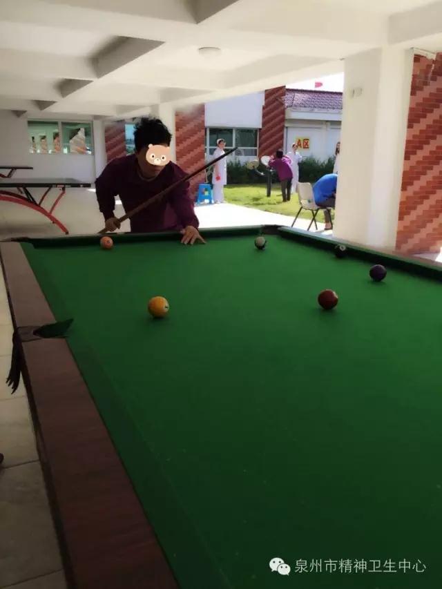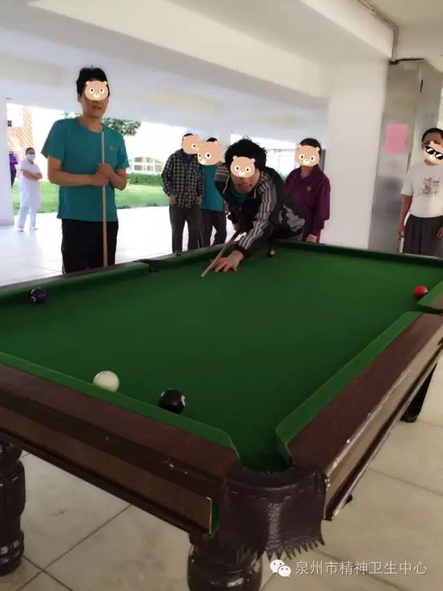 随着医学的发展,人们意识到社会环境、心理、社会因素对人身健康有着重大影响。同样也影响着住院精神病人的康复。精神病人在住院期间,除了给予药物治疗外,还应管理好生活,使他们的生活多样化,包括有规律的睡眠、饮食等。在生活中注入有计划的、适宜于各类病人的文娱体育活动和心理治疗,创造温馨的治疗环境对病人的治疗和早日康复,具有十分重要。因此,我们康复科开展各种各样的文娱体育活动,今天我们组织了一场“健康杯台球赛”。打台球,是一种心智的锻炼,时刻要保持着一个平稳的心态,做事不要操之过急,要不断的去思索,且不能仅仅只顾眼前的这一步。这也是我们想让患者体会到的寓意,让他们能够保持一个平稳的心态。
