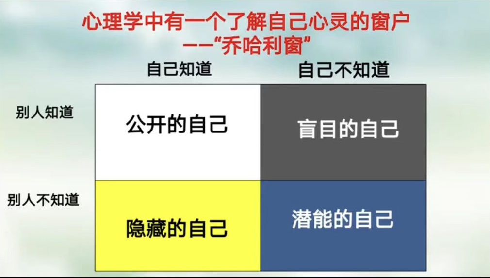 美国心理学家JoeLufthe和HarryIngam(1969)从自我概念的角度对人际沟通进行了深入的研究,并根据:“自己知道——自己不知”和“他人知道——他人不知”这两个维度,依据人际传播双方对传播内容的熟悉程度,将人际沟通信息划分为四个区:开放区、盲目区、隐秘区(又称隐藏区)和未知区(也称封闭区),这个理论称为“乔哈里视窗”。我们在团体中学习并运用这个理论,来帮助大家更好的认识自我。