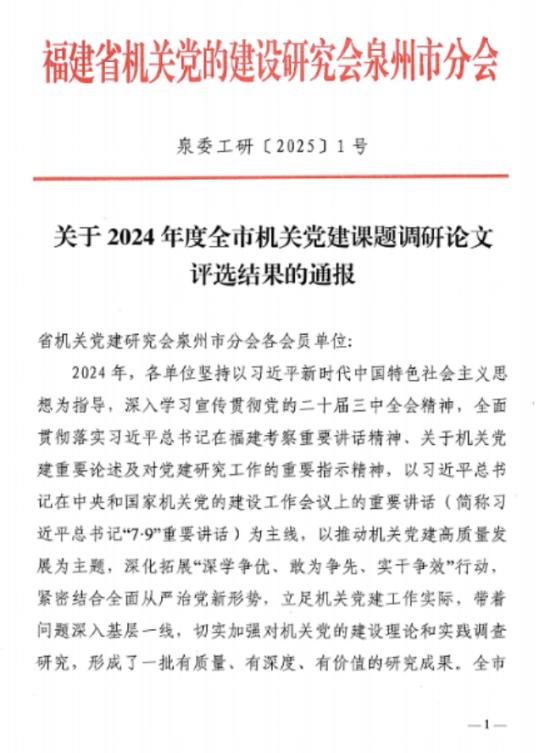 近日,福建省机关党建研究会泉州市分会公布了2024年度全市机关党建课题调研论文评选结果,性爱短视频 课题组报送的党建调研报告《构建三级网格监督体系,切实提升公立医院内设纪委监督实效的思考与对策》从200篇调研论文中脱颖而出,荣获2024年度全市机关党建调研课题调研论文三等奖。